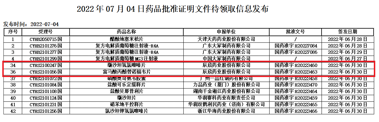 6月30日,辰欣藥業按照新4類申報的纈沙坦氫氯噻嗪片和富馬酸丙酚替諾福韋片獲國家藥監局批準上市,視同通過一致性評價。